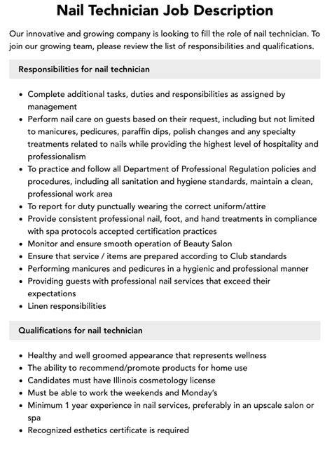 My dear readers, we hope this comprehensive guide has shed light on the fascinating world of nail technology. Whether you’re just starting out or looking to elevate your career, the nail tech job description offers a rewarding path filled with creativity, artistry, and human connection. We invite you to explore our other articles for further insights into this vibrant industry. Until next time, stay polished and keep creating beautiful nails!